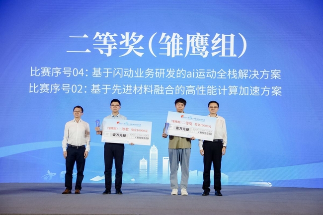 致公黨中央聯(lián)絡(luò)部副部長、留學(xué)人員委員會秘書長周慧(圖左),蘇州市人民政府副秘書長吳旭翔(圖右)為獲得“雛鷹組”一等獎的項目團(tuán)隊代表頒獎