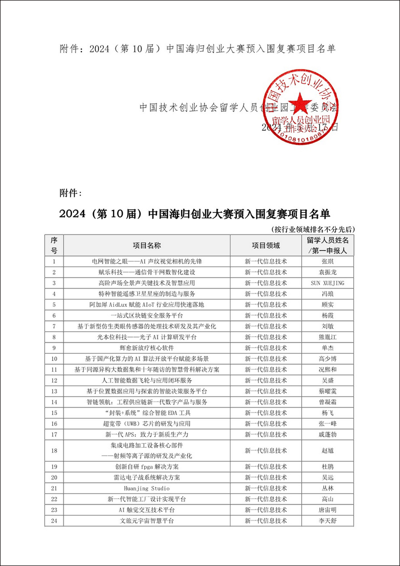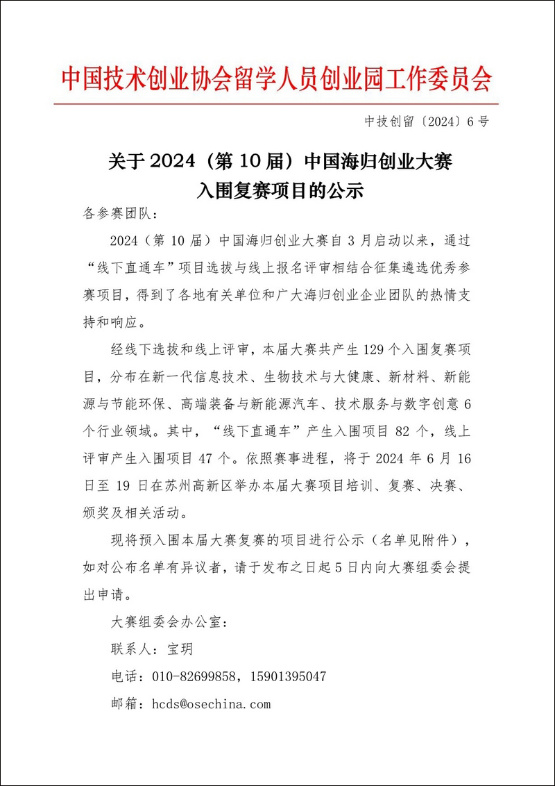 關于2024(第10屆)中國海歸創業大賽入圍復賽項目的公示